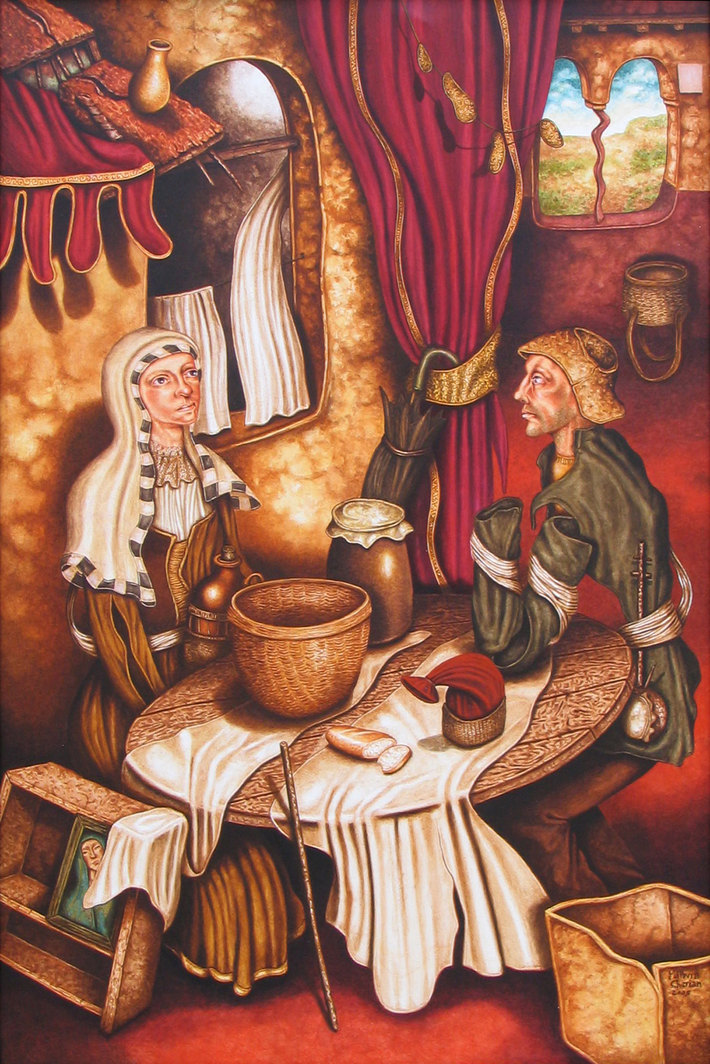 It is virtually impossible to categorize Milburn Cherian’s paintings into a particular cultural, chronological, or indeed even symbolic single perspective or style, except to point to archetypal truths embedded within an external visual Indian extravaganza. So one hesitates to know from which angle to begin to write about the multi-leveled shock of discovery upon first encounter with her paintings and again and again upon return.The initial effect of conglomerate, multiple, individual shapes offers the viewer, who is intent on entering this highly complex world of interacting forms, colours and symbols, the possibility of initiating, step by step, detail by meticulously executed detail, a journey which leads on towards an ultimately unified, single synthetic whole.